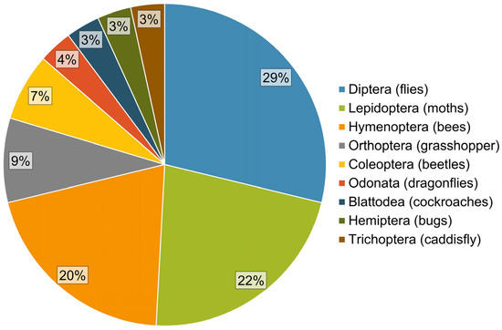 Species of interest in the reviewed articles are reported by order in Figure 4 as follows: Periplaneta americana [37], Reticulitermes speratus [38]), Coleoptera (Anaceana globulus [39], Leptinotarsa decemlineata [40], Tenebrio molitor [41], Trachyderma hispida [16]), Diptera (Aedes aegypti [42], Chironomus kiiensis [43], Chironomus riparius [20,44,45,46], Drosophila melanogaster [15,19,21,47,48,49,50,51,52], Hermetia illucens [53]), Hemiptera (Oncopeltus fasciatus [54,55]), Hymenoptera (Apis cerana [56], Apis mellifera [10,11,17,57,58,59,60,61,62,63], Atta sexdens [64]), Lepidoptera (Bombyx mori [65,66,67], Galleria mellonella [68,69,70,71,72,73], Ostrinia nubilalis [74], Spodoptera exigua [75,76], Spodoptera litura [77]), Orthoptera (Acheta domesticus [78], Aiolopus thalassinus [79,80], Locusta migratoria [13]), and Trichoptera (Hydropsyche pellucidula [81], Stenopsyche marmorata [82]). In addition, Diptera: Chironomidae; Odonata: Gomphus and Lestes [83]; and Orthoptera: Acridoidea [84] have also been studied.