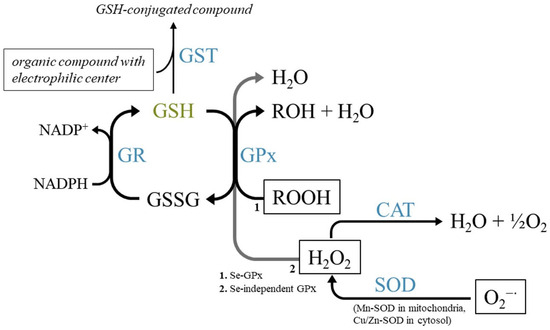 Assessment of glutathione reductase (GR) activity (Table A8) was performed to evaluate the regenerative capacity of glutathione in its reduced form (GSH), which is responsible for the functionality of GSH-related enzymes (such as GST and GPx) (Figure 5).