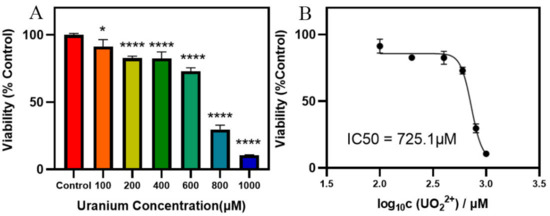 Uranium-reduced cell viability in HK-2 cells. (A) Cells were treated with different uranium level for 24 h, and viability was examined with the CCK-8 method. * p < 0.05, **** p < 0.0001. (B) The IC50 value of HK-2 cells after uranium treatment was 725.1 μM.