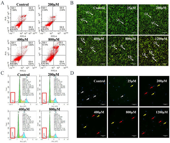 The sub-G1 peak in Figure 2C indicates the occurrence of apoptotic cells, more apoptotic cells were observed in the high uranium concentration group than in the low uranium concentration group, indicating that the apoptosis was aggravated at the concentration of 400–800 μM.