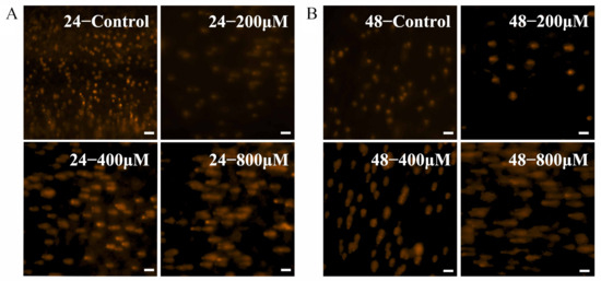 The cells were treated with different concentrations of uranyl ion and incubated for 24 h or 48 h. Glass slides were preheated at 50 °C, and 100 μL of 1% agarose was applied to a slide, followed by immediate cooling at 4 °C for 10 min. The 10 μL cells (1 × 104) were mixed with 75 μL of low-melting agarose (0.7%) and were layered over the base agarose. After solidification, another layer of low-melting agarose (75 μL, 0.7%) was added and the slides were cooled for 30 min. Subsequently, the slides were immersed in ice-cold lysis solution for 2 h, and were immersed in electrophoresis buffer (1 mmol/L EDTA, 300 mmol/L NaOH) for 40 min. Then electrophoresis was performed at 25 V for 20 min. After the completion of electrophoresis, slides were washed with PBS buffer for 10 min × 3 at 4 °C, then 20 μL of PI was added and a coverslip was placed over it and observed under a fluorescent microscope. Then, fluorescent microscopy images were taken (KFS210, Beijing BioRab Technology Co., Ltd., Beijing, China).