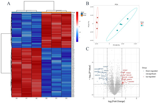 Proteomics of differentially expressed proteins in HK-2 cells exposed to 800 μM uranyl nitrate. (A) Clustering heat map. (B) PCA. (C) Volcano plot.