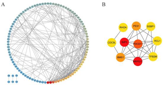 Figure 7A shows the differential proteins with interactions to each other, and the color from red to blue shows the interaction density from high to low. The top ten hub differential proteins with the closest protein interaction were selected, and it was found that hub proteins were closely related to ribosomes (Figure 7B and Table 2). The ten proteins with the closest protein–protein interaction relationships show that ribosomal proteins are closely involved in the process of cell damage caused by uranium. In addition, mitochondrial damage and abnormal cell cycle seems to be related to the cytotoxicity of uranium. These results are consistent with the abovementioned conclusions and the reports in the existing literature.