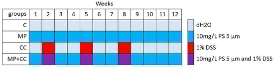 In the MP+CC group, a suspension of polystyrene microparticles was added to the drinking bowl throughout the experiment to a final concentration of 10 mg/L, and starting from the 8th, 29th and 50th experimental days for 7 days, additional DSS was added to a final concentration of 10 g/L. As in the other studies on the effects of MP on colitis severity, no additional substances were added to stabilize the MP suspension [,,,,].