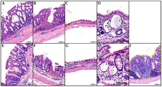 Distal colon of mice with chronic colitis (A–D) and chronic colitis with microplastic consumption (E–I), stained with hematoxylin and eosin. (A,E)—inflammatory infiltration (blue arrows), crypt architecture disorders (orange arrows), (B,F)—narrow ulcers (red dotted line), (C,G)—extensive ulcers (red dotted line), (D,H)—crypt abscesses (green arrows), (I)—adenocarcinoma (yellow dotted line).