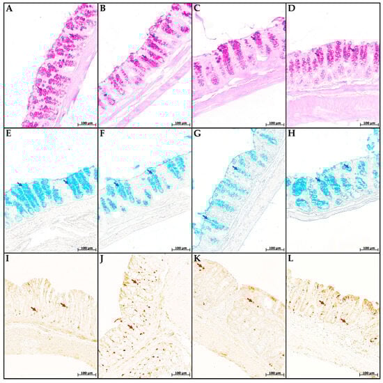 Neutral (A–D) and highly sulfated (E–H) mucins in goblet cells and endocrine cells (I–L) in the distal colon of mice in the control group (A,E,I), fed with microplastics (B,F,J), with chronic colitis (C,G,K) and with chronic colitis with microplastic consumption (D,H,L). (A–D) PAS reaction, neutral mucins in goblet cells are stained purple (violet arrows); (E–H) staining with Alcian blue pH 1.0, highly sulfated mucins in goblet cells are stained blue (blue arrows); (I–L)—immunohistochemical reaction with antibodies to chromogranin A, enteroendocrine cells of dark brown color (brown arrows).