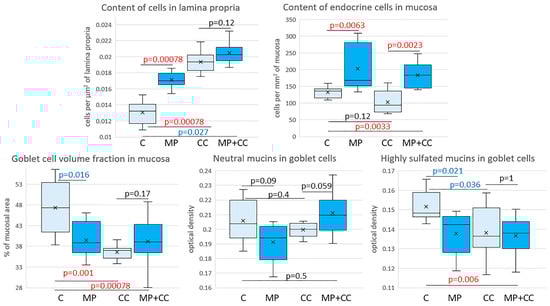 In the mice of the MP group, compared with the control group, the content of cells in the mucosa lamina propria statistically significantly increased. The chromogranin A-positive endocrine cell number increased. There was a tendency toward a decrease in the goblet cell volume fraction and the content of highly sulfated mucins in them, but the differences did not reach statistical significance (Figure 4 and Figure 5). In the CC and MP+CC groups, we assessed morphological changes in the zones outside the ulcers, but with the pronounced inflammatory changes. Compared with the control group, the number of cells in the mucosa lamina propria in both groups increased. The number of chromogranin A-positive endocrine cells did not differ from the control. The volume fraction of goblet cells in the CC group statistically significantly decreased, and in the MP+CC group there was a tendency to decrease. The highly sulfated mucins content in the MP+CC group statistically significantly decreased, and in the CC group there was a tendency to decrease. The neutral mucins content did not change.