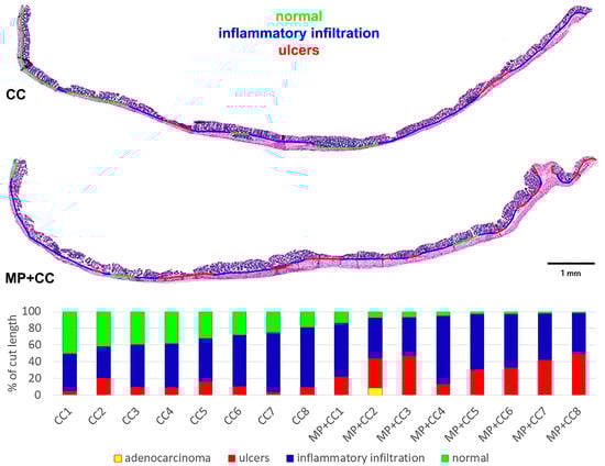 Prevalence of pathological changes in the distal colon during chronic colitis in mice not treated with MP (CC) and treated with MP (MP+CC).
