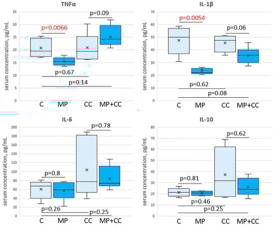 The content of cytokines TNFα, IL-1β, IL-6 and IL-10 in the blood serum of mice of the control group (C), fed with microplastics (MP), with chronic colitis (CC), and with chronic colitis with microplastic consumption (MP+CC) (n = 8). Red numbers are statistically significant changes.