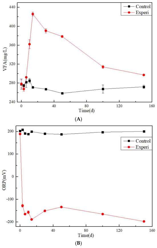 Meanwhile, the ORP in the control group remained at around 200 mV. However, in the Experi group, the ORP rapidly decreased within the first 10 days, reaching −200 mV, and then gradually showed a slight fluctuation trend. The reason for the decrease in ORP value is that yeast extract consumes high-oxidation substances such as dissolved oxygen and nitrate during anaerobic fermentation, reducing to an absolute anaerobic state.