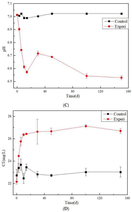 Meanwhile, the concentration of chloride ions in the aqueous solution remained constant in the control group in Figure 2. In the Experi group, its concentration increased rapidly in the early stage and gradually stabilized in the later stage. These data are also similar to the trend of contaminant concentration changes.