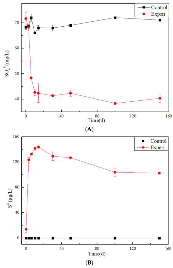 The concentration of sulfate ions in the control group remained basically unchanged at 68 mg/L in Figure 3. However, in the Experi group, the concentration of sulfate ions rapidly decreased within the first 10 days, reaching 40 mg/L, and then gradually showed a stable trend. Meanwhile, the concentration of S2− in the control group was maintained at 0 mg/L. However, in the Experi group, the concentration of S2− rapidly increased within the first 10 days, reaching 140 µg/L, and then gradually showed a slight downward trend. This is due to the reduction of sulfate ions, which produce S2−.