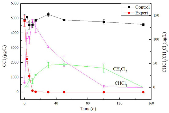 The concentration of CT in the control Experi group remained basically unchanged in Figure 4. No CF or DCM was detected for the control groups. In comparison, the decreasing CT concentration value indicated that CT was biodegraded. The concentration of CT has been completely degraded by 40 days and cannot be detected anymore. In addition, the concentrations of CF and DCM contaminants increase first and then decrease. It is supposed that CF and DCM are speculated to be intermediate products in the degradation process of CT. It is reported that at least three competing pathways of CT degradation were identified, which have been well established in laboratory experiments and field pilot-scale testing. They are the abiotic hydrolysis, reductive dehalogenation and reductive hydrolysis pathways [13]. The degradation pathway in this paper is in accordance with the reductive dehalogenation pathway.