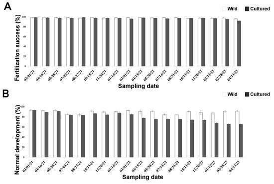 Quality assessment of early life stages in wild (white bars) and cultured (black bars) sea urchins during the two-year experiment. (A) Fertilization success rate after 40 min. (B) Larval development rate after 72 h post fertilization.