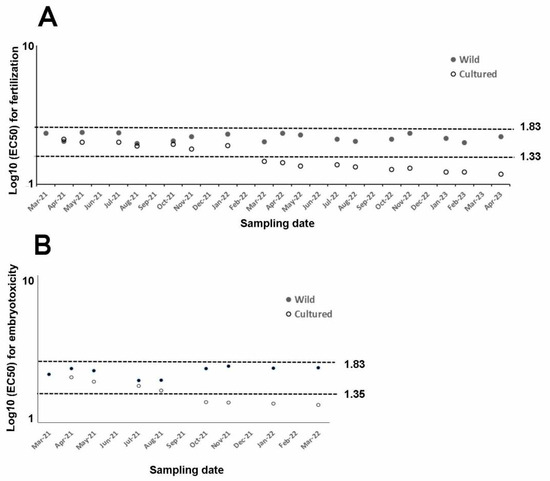In our case, only sea urchins reared for one year were used to assess embryotoxicity assays, while longer cultured periods (2 years) were selected for fertilization assays. Copper nitrate affected fertilization. Related EC50 from wild or captive sea urchins reported in the literature range between 21.69 µg/L and 68.18 µg/L [43,68,69,70,71,72,73]. They correspond to 1.33 and 1.83 log10 of EC50 (Figure 2A) and are consistent with those reported in this study for both wild and sea urchins cultured for 10 months.