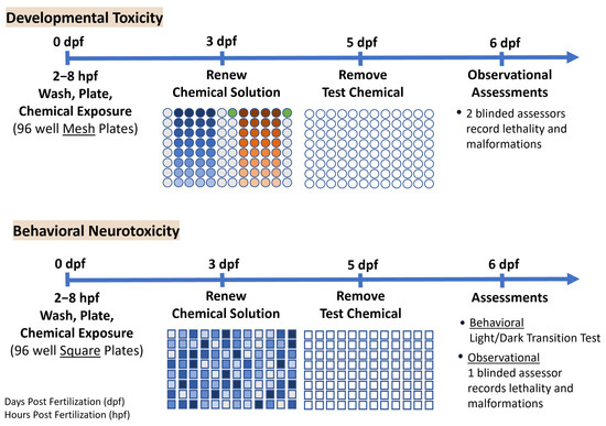 - Jarema, K.A.; Hunter, D.L.; Hill, B.N.; Olin, J.K.; Britton, K.N.; Waalkes, M.R.; Padilla, S. Developmental Neurotoxicity and Behavioral Screening in Larval Zebrafish with a Comparison to Other Published Results. Toxics 2022, 10, 256. [Google Scholar] [CrossRef]