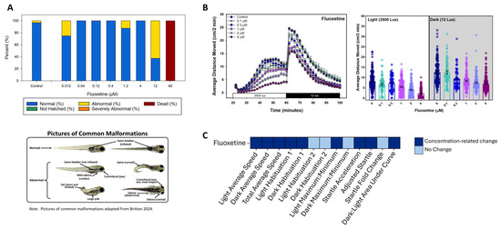 Fluoxetine results following the developmental toxicity and behavioral neurotoxicity experiments. The bar graph in Panel (A) presents data from the developmental toxicity observational assessments indicating the status (percent normal, not hatched, abnormal, severely abnormal, and dead); the vertical axis indicates percent (%) affected while the horizontal axis shows fluoxetine concentrations ≤ 40 µM (n = 28 for 40 µM and n = 8 for all lower concentrations). Beneath the graph are pictures of common malformations previously published by our laboratory [45]. The photos illustrate various malformations and normal-looking images. Panel (B) combines the four fluoxetine (0–4 µM) behavioral neurotoxicity experiments together and shows the average distance moved every two minutes in a line graph on the left, and a bar graph on the right with the average distance moved in the light and dark periods separately, with the average for each individual larva represented by the circles. Panel (C) presents the behavioral neurotoxicity results from a 13-endpoint analysis in a heatmap, identifying 9 of the 13 endpoints that displayed significant concentration-related changes.