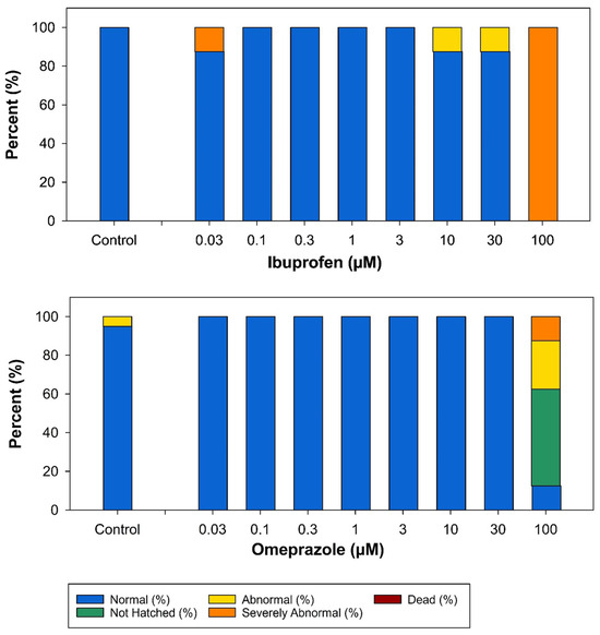 Bar graph showing the developmental toxicity results for ibuprofen and omeprazole at concentrations ≤ 100 µM (n = 8 for all concentrations). Observational assessment data is presented for the following percentages: normal, not hatched, abnormal, severely abnormal, and dead. The vertical axis indicates percent affected, while the horizontal axis shows concentration (µM).