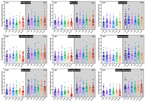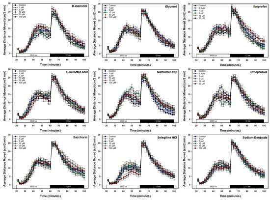 The published literature on larval locomotor behavioral changes produced by developmental exposure to the other eight chemicals (L-ascorbic acid, glycerol, sodium benzoate, saccharin, D-mannitol, metformin hydrochloride, ibuprofen, or omeprazole) showed diverse results. Studies that tested similar concentrations as the present paper observed changes in locomotor activity following L-ascorbic acid exposure [37,38], while Luis and coworkers only noted changes in locomotor activity at L-ascorbic acid concentrations that also elicited significant lethality [57]. Our own previous work [11], along with two other studies [37,54] assessing behavioral neurotoxicity in larvae treated developmentally with saccharin, reported no behavioral changes, whereas another publication reported locomotor changes [38]. Only one study performed a light–dark transition assay in metformin-treated zebrafish and found no changes in locomotor behavior after exposure to millimolar concentrations [76].