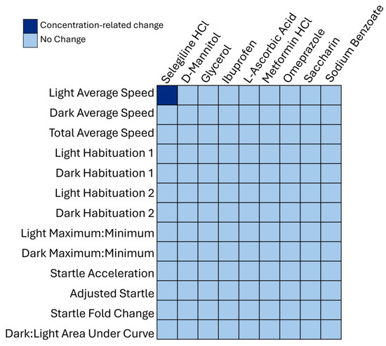 Behavioral neurotoxicity results from a 13-endpoint analysis presented in a heatmap identifying only one endpoint (light average speed for selegiline hydrochloride) that revealed a concentration-related change based on the concentration–response modeling analysis, shaded dark blue. The endpoints that did not show any changes are shaded light blue. The 13 endpoints are listed on the vertical axis and chemicals on the horizontal axis.