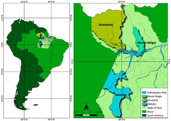 Samples were taken from three municipalities located in western Pará, in the lower Amazon (Figure 1). Two were selected for their intense mineral exploitation: Itaituba, where the largest small-scale gold mines are located; Oriximiná, a region where bauxite has been exploited since 1969; and Monte Alegre, which has no mining activity, but is under pressure from agricultural activity, mainly monocultures such as soya and maize. In each municipality, ten samples of muscle tissue from the tail (medial dorsal sacrocaudal muscle), weighing 100 g each, were collected from different butchers, totaling 30 samples, which were then stored at an average temperature of 4 °C, and to the laboratory and frozen at −20 °C until analysis. Although we do not have precise information about animal origin, we sampled from different butcher shops on different days, choosing specific types of butcher shops, to ensure that each sampled animal came from a different farm within the municipality. Previous visits to the butcher were performed to obtain information with the owners about the source of the meat, and the sampling scheme was based on this information to spread our limited sample size across the greatest number of farms possible.