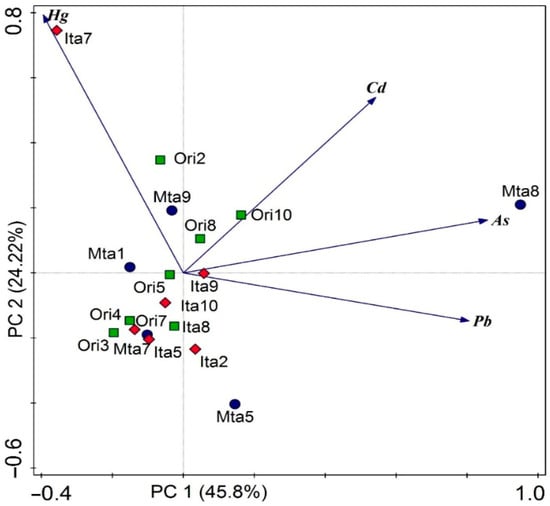Ordering diagram of the analysis of principal components of heavy metals sampled from the muscles of cattle from three large centers in western Pará. Legend: Ori—Oriximiná; Mta—Monte Alegre; Ita—Itaituba.