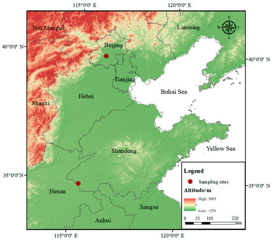 Two sampling sites for volatile phenols were set up in Beijing (N 39°56′10.36″, E 116°18′43.44″) and Heze (N 34°51′1.23″, E 115°24′28.63″) in the North China Plain. In December 2022 and March 2023, samples were taken at the two sampling sites at the same time. The sampling sites are shown in Figure 1. The Beijing station is located in the center of the city, with convenient transportation around it. It is adjacent to the transportation artery and relies on the West Third Ring Road, the main road of Beijing. There are gas stations, restaurants, residential areas, etc. nearby, which have typical urban characteristics. The sampling site in Heze is located in a village, which is ecological wetlands along the Yellow River Road near the site, close to the crop planting land; local residents are mainly engaged in agricultural activities, the cooking method is mainly wood burning and natural gas, and there are no enterprises with serious pollution emission such as factories in the vicinity. The sampling procedures followed the “Technical guidelines for fugitive emissions monitoring of air pollutants” (HJ/T55-2000). Air samples were collected using an air sampler (QC-IB, Beijing Ke’an Labor Insurance New Technology Co., Ltd., Beijing, China) and XAD-7 resin sampling tubes with an inner diameter of 6 mm, an outer diameter of 8 mm, and a length of 11 mm. The sample flow rate was set at 0.3 L/min, and the sampling duration was 4 h. Sampling periods were divided into three time slots: 8:00–12:00 in the morning, 12:00–16:00 in the afternoon, and 16:00–20:00 in the evening. The collected samples were stored below 4 °C in the dark, and analyses were completed in a timely manner. Beijing obtained a total of 57 valid samples, including 6 parallel double samples (accounting for 10.5%, meeting the standard requirements), and 4 blank samples (2 field blanks, 2 laboratory blanks). Similarly, Heze obtained a total of 60 valid samples, including 6 parallel double samples (accounting for 10.0% of the total and fulfilling the standard requirements), along with 7 blank samples (consisting of 5 field blanks and 2 laboratory blanks).