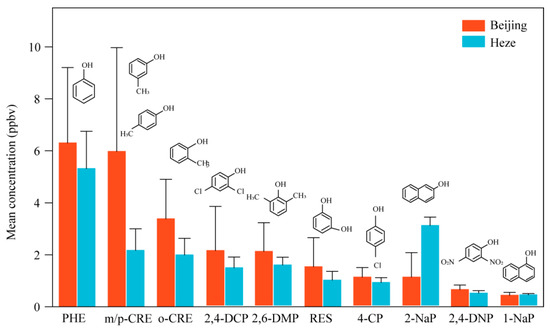 In the present research, 11 phenolic compounds in the atmosphere, which included resorcinol (RES), phenol (PHE), o-cresol (o-CRE), m/p-cresol (m/p-CRE), 2,4-dinitrophenol (2,4-DNP), 4-chlorophenol (4-CP), 1-naphthol (1-NaP), 2-naphthol (2-NaP), 2,6-dimethylphenol (2,6-DMP), and 2,4-dichlorophenol (2,4-DCP), were analyzed. The mean total concentration during winter in Beijing and Heze were 23.60 ± 8.99 ppbv and 18.38 ± 2.34 ppbv, ranging from 19.60 to 35.50 ppbv and 16.86–19.93 ppbv, respectively. Among the detected 11 phenols, PHE had the highest concentration, an observed 6.30 ppbv in Beijing and 5.32 ppbv in Heze (Figure 2). Despite the limited availability of phenol-related reports, several studies have documented the concentrations of volatile phenols. The concentrations observed in our current study are significantly elevated compared to those reported in prior investigations. Specifically, the values reported for Jinan are 16.7 ± 3.7 ng/m3 [9], while the concentrations range from 6.5 to 10.4 ng/m3 for Strasbourg [26] and 114 ng/m3 for Santiago [42]. This variance can primarily be attributed to differences in the sampling methodologies employed. It is noteworthy that prior studies primarily utilized PUF membranes for capturing and enriching atmospheric phenols. However, given the high flow rates utilized in these studies, the enrichment efficiency may have been significantly lower compared to our current study.