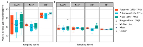 Daily change characteristics of phenols under different pollution conditions in winter of Beijing (a) and Heze (b). SADs: superior air quality days, SMP: slight-moderate pollution, HP: heavy pollution, SP: severe pollution. Air quality is determined based on the AQI index of the day—SAD: 0–100, SMP: 101–200, HP: 201–300HP, SP > 300. The AQI index is obtained from the website of China Environmental Monitoring General Station: https://www.cnemc.cn/ (accessed on 27 April 2025).
