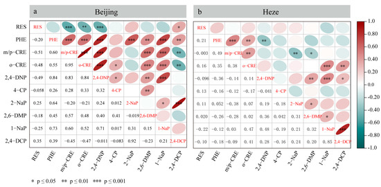 To elucidate the similarities in sources or formation pathways of phenolic compounds, Pearson correlation analyses were performed on winter observations from Beijing (Figure 4a) and Heze (Figure 4b). The results reveal distinct correlation patterns that reflect region-specific emission characteristics and atmospheric processes.