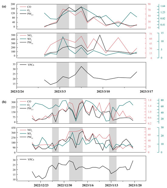 Trends in various parameters and volatile phenolic compounds (VPCs) at the Beijing (a) and Heze (b) stations. The shaded areas indicate typical periods of high ozone/heavy pollution. The units for each parameter are as follows: CO (mg/m3); O3, PM2.5, NO2, SO2, PM10 (μg/m3); VPCs (ppbv).