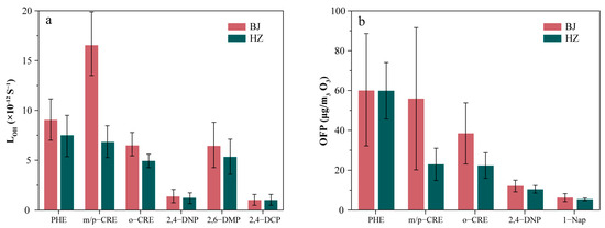 The LOH results for volatile phenolic compounds in the two regions are shown in Figure 6a. The LOH values of volatile phenols in Beijing and Heze were calculated to be 36.86 × 10−12 s−1 and 22.06 × 10−12 s−1, respectively. Previous reports indicate that the LOH of non-methane hydrocarbon-like PAMS in Beijing was reported to be 11 × 10−12 s−1 [35,53]. In cities with similar urban structures, such as Xianyang and Tongchuan in Shanxi province, the total LOH of OVOCs (aldehydes and ketones) and NMHCs was reported to be 20.2 × 10−12 s−1 and 17.7 × 10−12 s−1, respectively [54]. In Xiamen SAR, a highly developed city with a similar economic level to Beijing, the LOH of VOCs was reported to be 18.6 × 10−12 s−1 [55]. The LOH of VOCs in cities with a comparable urban structure to Heze, such as Baoding and Cangzhou in Hebei province, has been reported to be 13.02 × 10−12 s−1 and 14.72 × 10−12 s−1, respectively [56]. In Baoji, a highly developed city with an economic level comparable to Heze, the LOH of VOCs was reported to be 10.3 × 10−12 s−1 [57]. For detailed comparison results, please refer to Supplementary Materials Table S3.