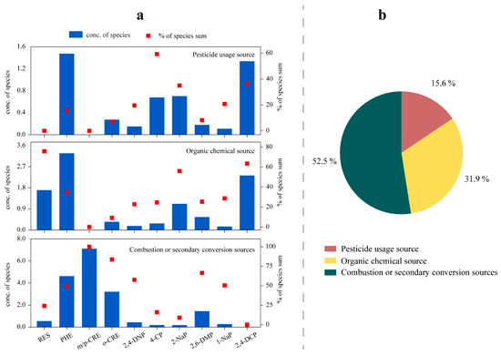 Results of fitting based on the PMF model. (a) Atmospheric species concentrations (blue bars) and their percentages in total species (red dots) corresponding to three pollution sources (pesticide use sources, organic chemical sources, and combustion or secondary transformation sources); (b) contribution percentages of various sources.