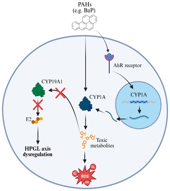 The biotransformation of PAHs in marine organisms is a process largely mediated by enzymes of the cytochrome P450 family, notably CYP1A, whose expression is regulated by the activation of the aryl hydrocarbon receptor (AhR) after the pollutant enters the cell [104,113]. This mechanism has been consistently identified as one of the main detoxification pathways, but it is not entirely risk-free, since the metabolites formed are often more toxic and reactive than the original compounds [29,114]. In addition, the metabolic activation of PAHs through CYP1A can generate reactive oxygen species (ROS), which contribute to oxidative stress and further exacerbate cellular and reproductive damage [29].