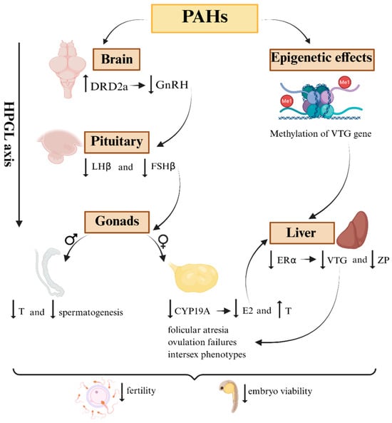 Schematic representation of how PAHs disrupt the HPGL axis in marine fish. In the brain, an increase in the expression of dopaminergic receptors (DRD2) inhibits the release of gonadotropin-releasing hormone (GnRH). This dysregulation reduces the hypothalamic stimulus to the pituitary gland, resulting in a decrease in the expression and release of the gonadotropins LHβ and FSHβ. Subsequently, the effects extend to the gonads, where aromatase (CYP19a) is suppressed. As a consequence, there is an accumulation of testosterone (T) and a reduction in estradiol levels (E2). This leads to a reduction in the expression of estrogen receptors (ERα), vitellogenin (VTG), and zona pellucida proteins (ZP2 and ZP3) in the liver. Epigenetics represents an additional axis of dysregulation, with increased methylation in key genes such as VTG, resulting in persistent or transgenerational changes even after the end of exposure.