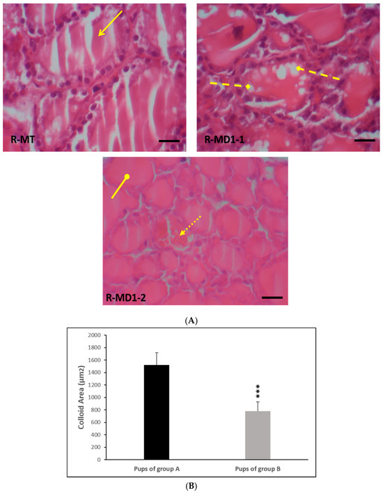 (A) Histological thyroid sections of 14-day-old rats using H&E staining. Group A (R-MT1) and pups in group B breastfed by mothers from day 1 of pregnancy until day 14 (R-MD1-1 and R-MD1-2). (B) Histomorphometric analysis of colloid area (µm2). H&E (200X and 400X). Values are expressed as means ± SD. Significant differences between pups in group A and group B: *** p ≤ 0.001.