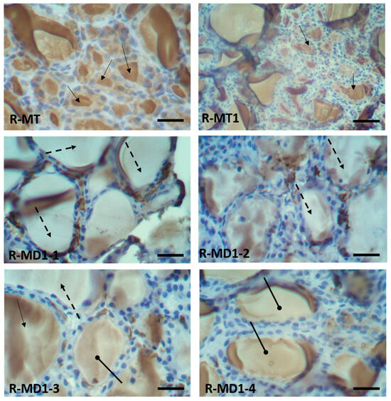 Immunohistochemistry in thyroid sections of 14-day-old rats with specific antibody against thyroglobulin protein. Histological sections of pups in group A (R-MT and R-MT1) and pups in group B (R-MD1-1, R-MD1-2, R-MD1-3 and R-MD1-4).