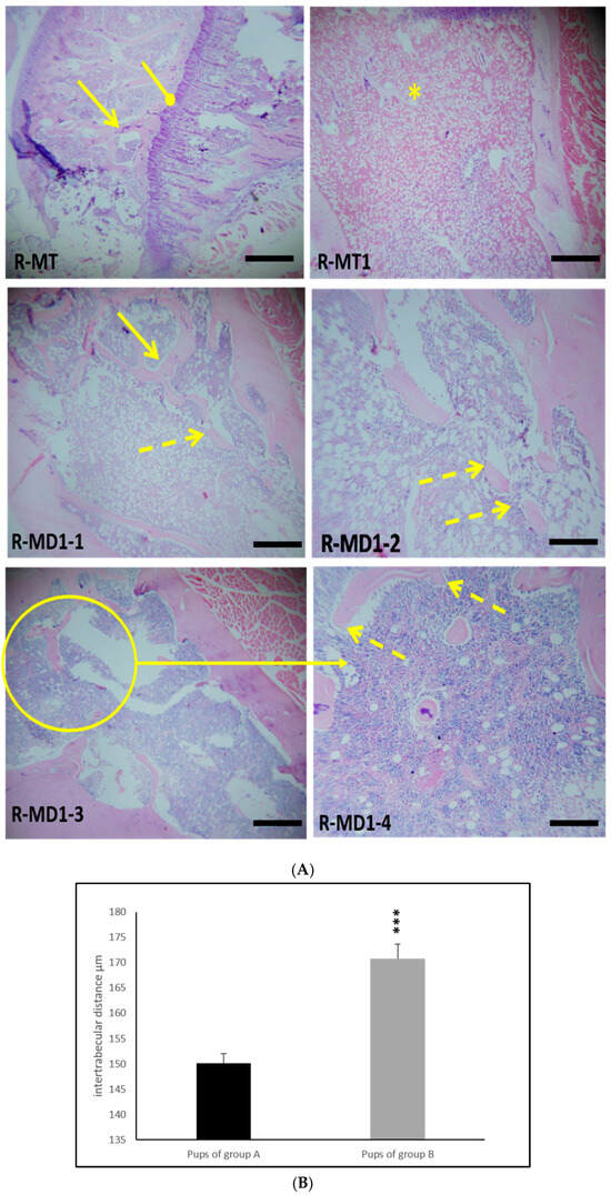 (A) H&E-stained sections of distal femora (epiphysis) of 14-day-old rats in group A (R-TM and R-TM1) and pups in group B (R-MD1-1, R-MD1-2, R-MD1-3, and R-MD1-4). Histological study showed a thinning and discontinuity of trabecular bone as well as decreased connectivity of bone trabeculae and disorganization of femur growth plate. (B) Histomorphometric analysis of intertrabecular distance in trabecular bone. Values are expressed as means ± SD. Significant differences between pups from group A and group B: *** p ≤ 0.001. Original magnification of H&E stain 200X and 400X.