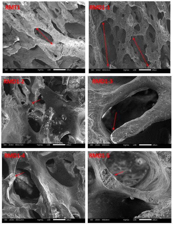 SEM micrographs of femora from pups (14 days old): group A (RMT1) and group B (RMD1-1, RMD1-2, RMD1-3, RMD1-4 and RMD1-5). Decreased connectivity and thinning of bone trabeculae can be observed. Original magnification 20×; 100× and 500×.