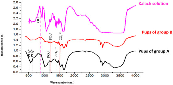 The FTIR spectra of bone powder collected from the femora of pups in group A and group B are shown in Figure 5. Wave-number shifts observed in the spectra (detailed in Table 4) indicate molecular disturbances induced by KL treatment.
