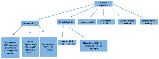 - Thakur, M.; Rachamalla, M.; Niyogi, S.; Datusalia, A.K.; Flora, S.J.S. Molecular Mechanism of Arsenic-Induced Neurotoxicity including Neuronal Dysfunctions. Int. J. Mol. Sci. 2021, 22, 10077. [Google Scholar] [CrossRef] [PubMed]