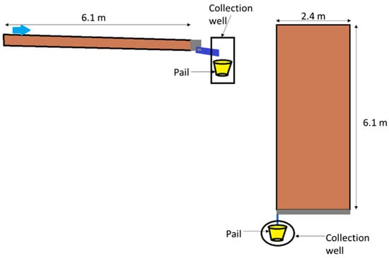 Agricultural field plots were located on North Farm, which is owned by the University of Kentucky in Lexington, Kentucky, USA (38.12144° N, 84.48714° W), and evaluated during the growing season of 2022. The soil was classified as Maury Silty Loam, additional information on the initial soil conditions is in Supplemental Information Table S1 []. Plots construction is detailed in Edwards et al. [] and shown in Figure 1. In summary, the field site comprised 30 individual 2.4 m by 6.1 m plots with a 3% slope. The plots were contained using impermeable steel borders driven 10 cm into the soil with 10 cm remaining above the soil surface along three edges to direct water flow to the down gradient point with the final edge comprising a stainless gutter and PVC pipe to direct runoff into a 14 L polyethylene pail for sample collection. Collection pails were covered to prevent dilution from rainwater and degradation from sunlight.