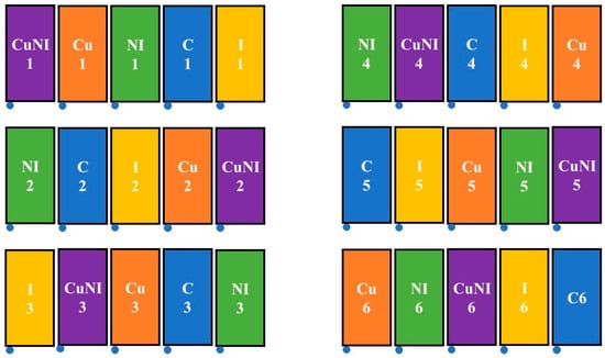 Field plot treatment design. Treatments included: C—control (blue), Cu—copper nanopesticide (orange), CuNI—copper nanopesticide and nano-imidacloprid (purple), NI—nano-imidacloprid (green), and I—imidacloprid (yellow).