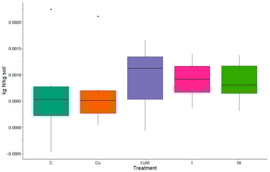 The total Cu observed in soils in our study did have significant differences (p = 0.0068) between treatments, with plots receiving copper (II) hydroxide (Cu and CuNI) gaining 1.55 and 1.32 kg ha−1, respectively, retaining majority of the copper applied, in the top 20 cm of the soil. However, other plots lost total Cu in from the top 20 cm soil (Figure 4). These observations were similar to Wightwick et al. [], where vineyards with high Cu pesticide applications were assessed and reported to have an increase in soil Cu concentrations compared to local areas. Soil Cu toxicity to soil invertebrates and crops has been observed to vary with soil properties []. For example, observed in Criel et al. [] evaluated varying concentrations of soil Cu to identify toxicity levels for invertebrates in a variety of soils. Similarly, Zhang et al. [] evaluated varied concentrations of soil Cu and cadmium (Cd) to identify toxicity levels for barley in a variety of soils. However, in Zhang et al. [] did not approach the critical values for Cu toxicity, 8.27 to 50.13 mg kg−1, in soil following one year with concentrations averaging 2.03 mg kg−1 in applied plots. Although our observations of were well below chronic concentrations identified [,], future field studies should investigate environmental implications following prolonged application and exposure to these nanopesticides.