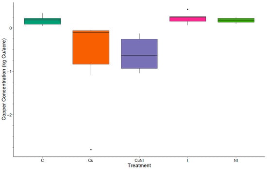 Box plot of total copper loss by treatment (mass[kg/acre], n = 5) between pre-applications at the beginning of the growing season and end of the growing season by treatment (n = 5).