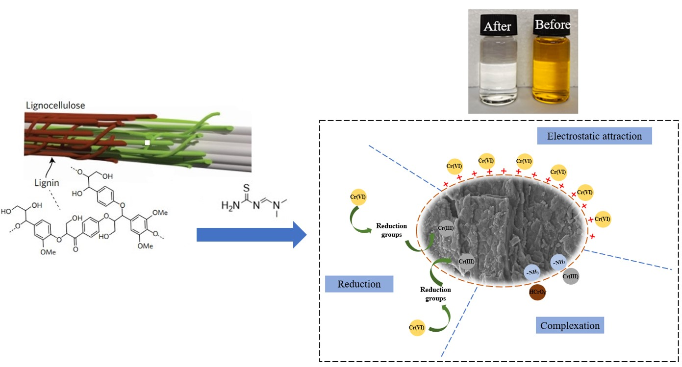 This study synthesized a novel aminated lignin adsorbent (AL) co-functionalized with nitrogen and sulfur heteroatoms, demonstrating robust stability and enhanced adsorption capacity for hexavalent chromium (Cr (VI)). Batch adsorption experiments systematically evaluated key operational parameters affecting Cr (VI) removal efficiency, including solution pH, initial Cr (VI) concentration, contact time, temperature, and adsorbent dosage. Adsorption kinetics and isotherm models were employed to analyze the uptake behavior. Furthermore, reusability assessment confirmed its regenerative potential.