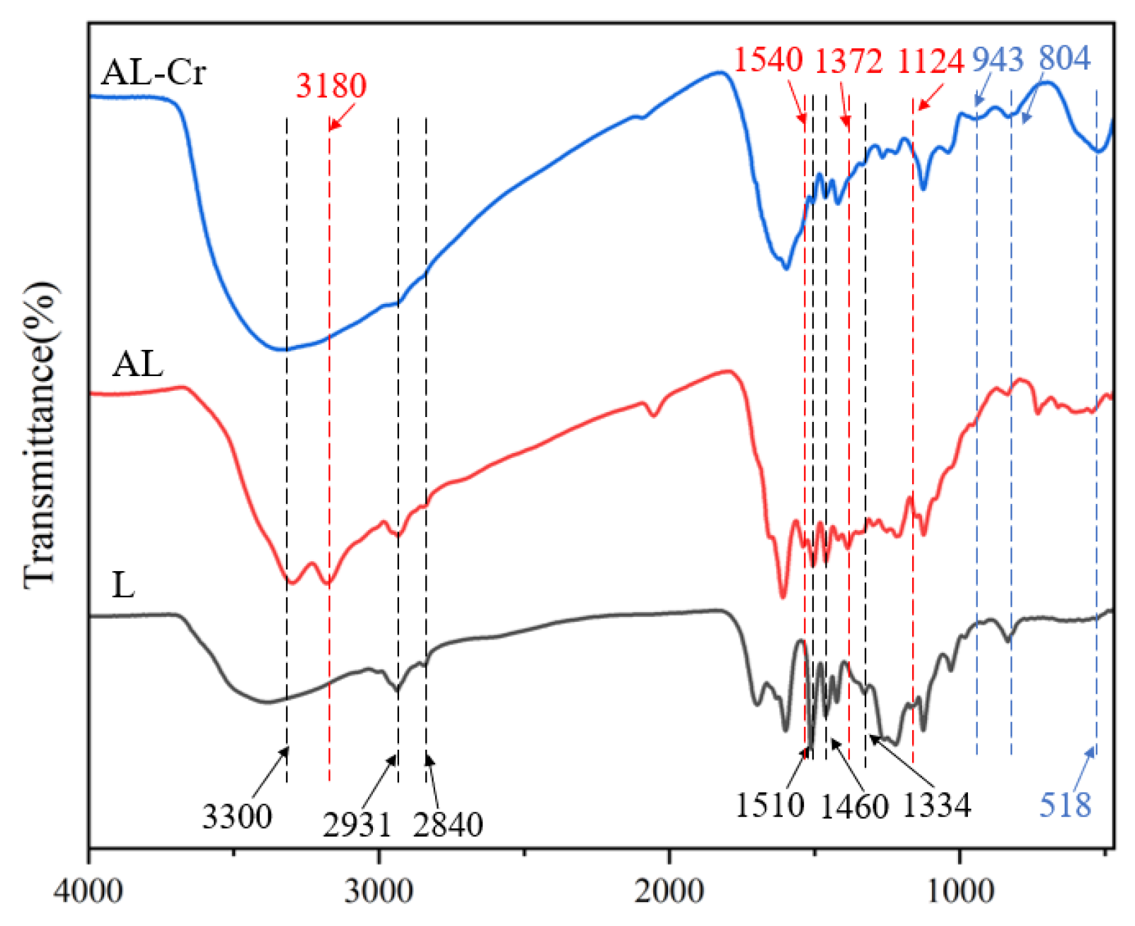 Figure 1, notable changes occurred in the FTIR spectrum of AL after adsorption (denoted as AL-Cr). Specifically, the peak intensities associated with methyl and methylene stretching vibrations at 2931 cm