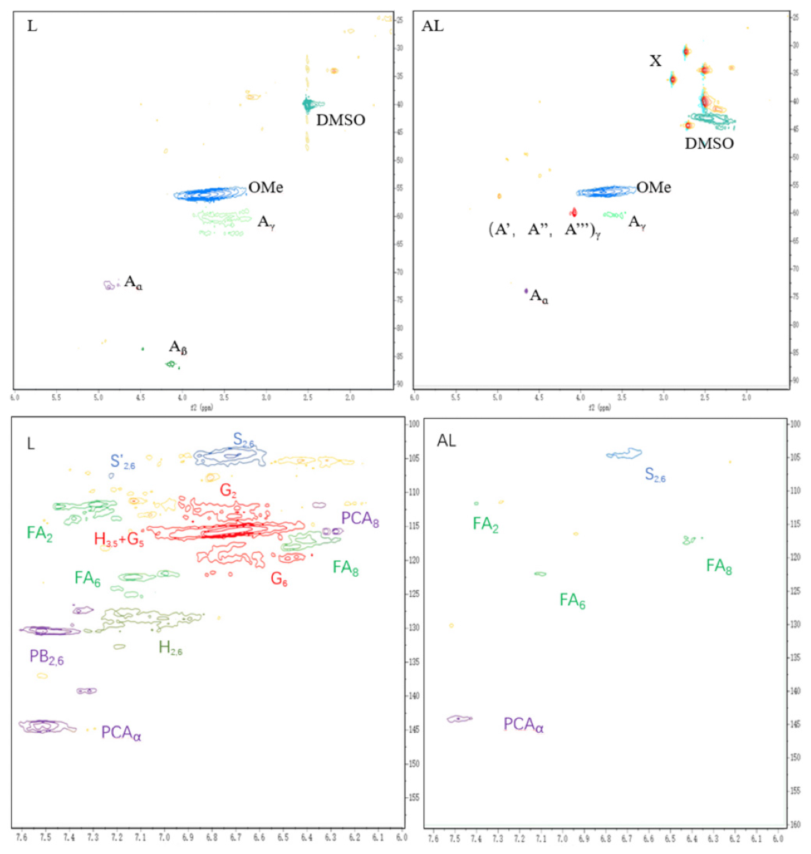 H (31.1/2.74, 34.44/2.51, and 36.15/2.89) can be observed in the 2D HSQC pattern of AL compared to L. These new signals can be attributed to the methyl and methylene groups in the TUFA structure, and these emerging signal peaks clearly confirm that TUFA has been successfully grafted into lignin. Additionally, the intensity of the signals attributed to G