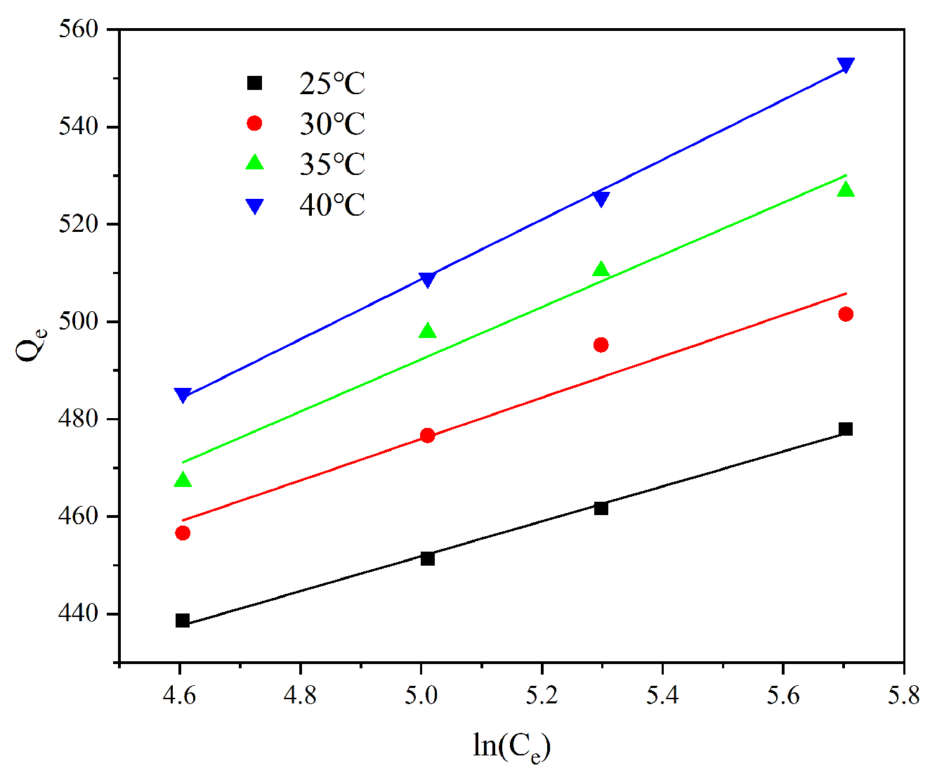 AT is the equilibrium binding constant; BT = (RT/b), a plot of Qe versus lnCe, yielded a linear line.