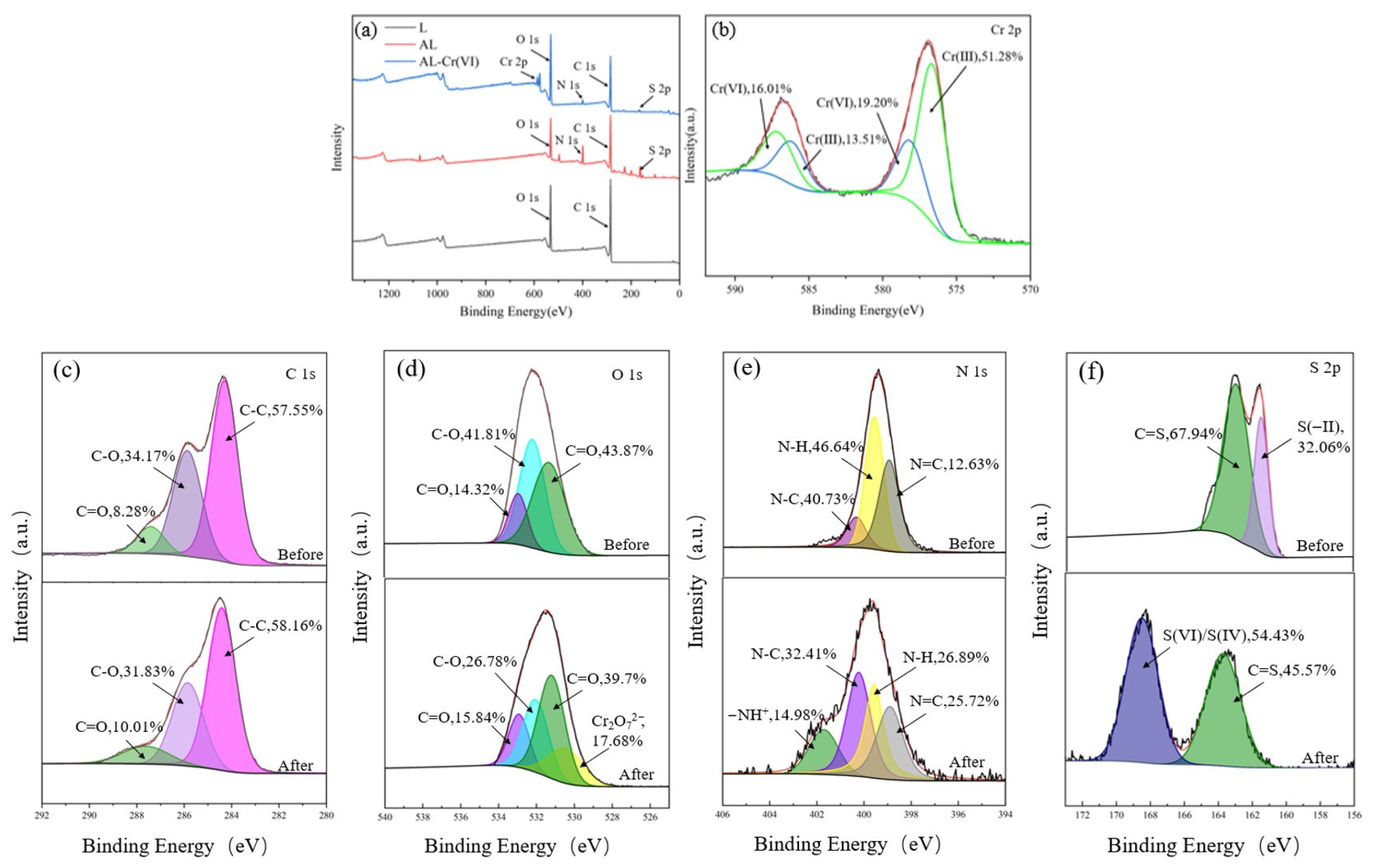 Figure 10a, indicating that chromium ions have been successfully adsorbed onto AL. Each Cr 2p can be divided into two peaks, as shown in